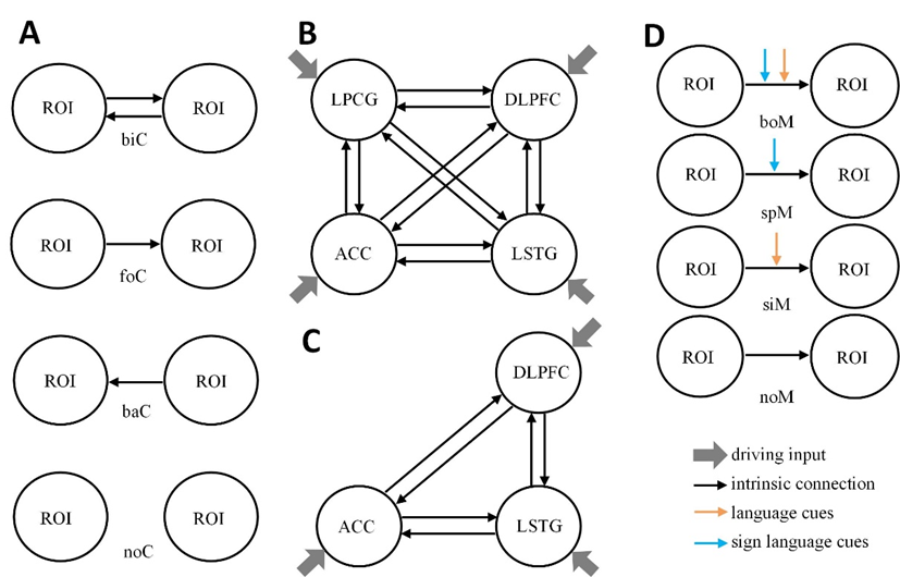 图1,DCM模型的构建。A:每对ROI 之间有效连接的四个可能的模式;B:双语任务的四个ROI的全连接模型;C:口语产生任务的三个ROI的全连接模型;D:每条有效连接受到口语条件和手语条件调节的四个可能的模式。biC双向连接,foC前向连接,baC反向连接,noC没有连接;boM连接受两个条件调节,spM口语条件调节,siM手语条件调节,noM不受调节。
