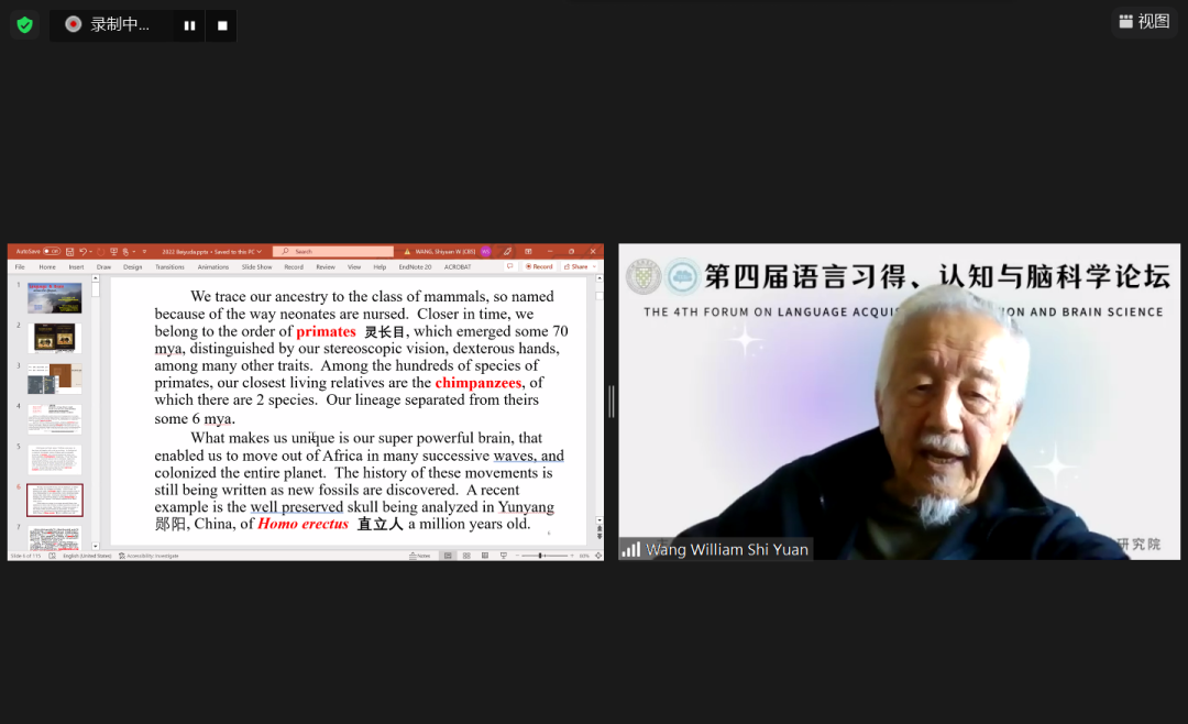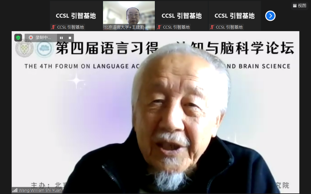 On December 27, 2022, Professor Wang Shiyuan, an internationally renowned linguist from the Hong Kong Polytechnic University, gave a wonderful online lecture entitled "Language and Brain Across the Lifespan" to our students and teachers. This is the seventh lecture of the "Fourth Academic Forum on Language Acquisition, Cognition and Brain Science", which was hosted by Prof. Wang Jianqin, the director of CCSL, and attended by more than 180 people from home and abroad.