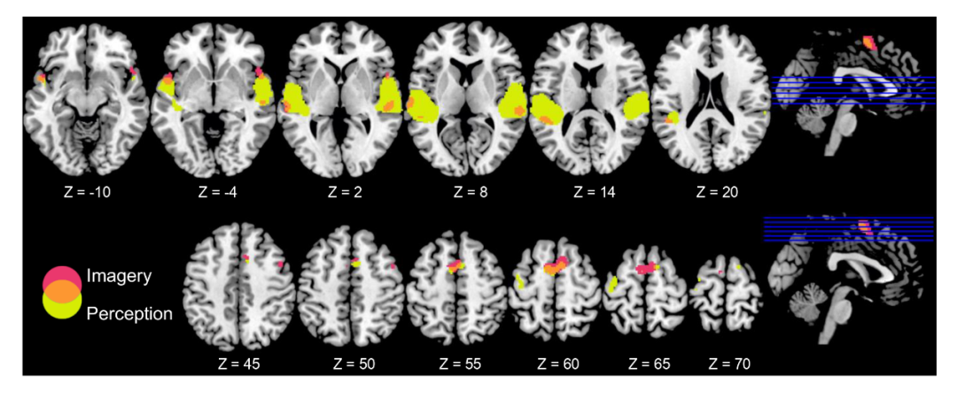 Figure 3, Similarities and differences in brain activation between verbal imagery and verbal perception.