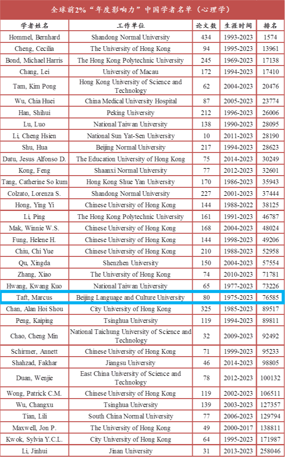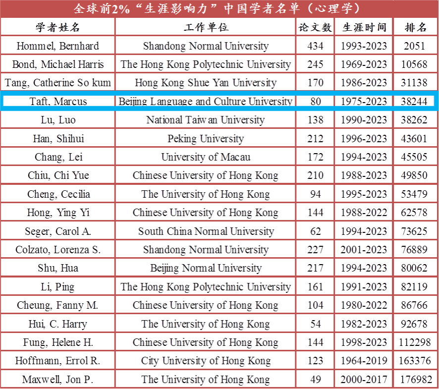 Professor Marcus Taft, a specially appointed professor atCenter forCognitive Scienceof Languageat Beijing Languageand CultureUniversity, has been listed in the top 2% of global scholars in both the “career impact” and “annual impact” rankings.