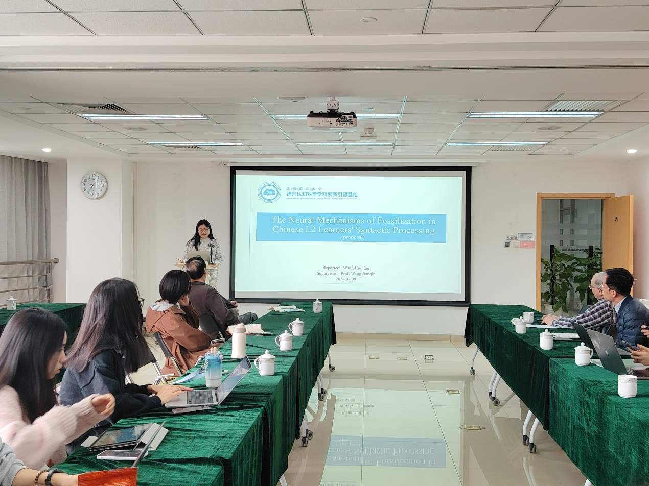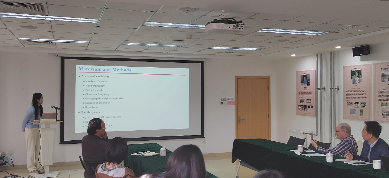 Wang Huiping's presentation was entitled "The Neural Mechanisms of Fossilization in Chinese L2 Learners' Syntactic Processing". She introduced the concepts of "Fossilization", "Critical Period" and "Implicit and Explicit Learning". Explicit Learning", pointed out the problems of the existing research, and put forward research ideas and plans. Lin Lin presented a paper entitled "A Study on the Neural Mechanisms of Auditory Modalities in Disyllabic Compound Words-An experiment design ". Taking Chinese compound words as the research object, she utilized the neural image analysis technique to study the effects of transparency and word frequency on the processing of Chinese compound words. Xie Shiyang's report is entitled "The effect of the semantic relatedness between disyllabic words and their constituents during visual word recognition ". She introduced the experimental design and other research contents.