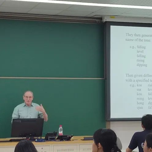 2. Organizing Academic Lectures:** On May 24th, 2023, Professor Marcus Taft delivered an insightful academic lecture to our university's faculty and students. The lecture was titled "Some Thoughts on Chinese Tones: Mental Representation and Second-language Teaching" and drew an audience of over 40 individuals. Professor Taft's presentation comprised two main parts: firstly, he introduced the "mental representation of tones" by incorporating multiple experiments in speech production and phonetic judgment; secondly, he discussed tone learning in Chinese as a second language and shared his innovative "TAFT" method for learning Chinese tones, which involves using letters to represent tone marks inserted after vowels, e.g., "Yihng," "Yiwng," "Yiyng," corresponding to the second, third, and fourth tones. Professor Taft's subsequent research indicated that the TAFT system is more helpful for Chinese as a second language learners in tone memory. The lecture combined both theory and practical methods, providing valuable insights to those in attendance.
